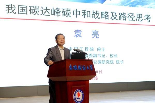 11月20日,由安徽财经大学主办的“双碳”背景下经济高质量发展论坛在蚌埠举行,校党委副书记、校长袁亮院士受邀参加论坛,就碳中和碳达峰战略背景下的产业创新升级和经济高质量发展同与会专家学者展开讨论,并作《我国碳达峰碳中和战略及路径思考》专题学术报告。